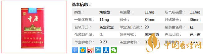 重慶紅香煙,煙長84mm,過濾嘴長:36mm,焦油量11mg,采用濾嘴通風(fēng)技術(shù),有效降低了煙氣中有害物質(zhì)的含量,順應(yīng)了目前降焦減害的發(fā)展方向。味道醇淡順口,比較合口味,總得來說很不錯,煙燃燒很好,口感一般,偶爾抽抽還是可以。