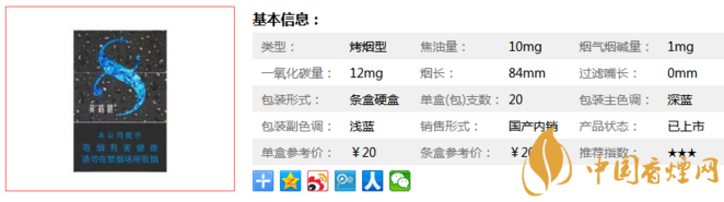 | 煙長(zhǎng):84mm | 過(guò)濾嘴長(zhǎng):36mm | 包裝形式:條盒硬盒 | 單盒(包)支數(shù):20 |