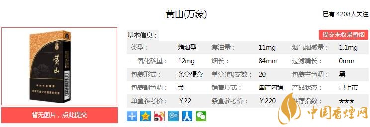 黃山萬象煙支長84mm,過濾嘴長35mm,煙嘴是金色,配的黑色的圓圈做點(diǎn)綴,煙支的顏色為咖啡色。下面我們一起來看黃山萬象的參數(shù)信息:焦油量:11mg 煙堿量:1.1mg 一氧化碳量:12mg