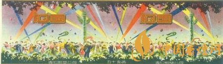 最為獨(dú)特的團(tuán)結(jié)主題煙標(biāo)莫過于貴陽煙草公司出品的“祖國”煙標(biāo)。這枚出品于上世紀(jì)50年代的煙標(biāo),以橫長(zhǎng)的寬幅全景畫面,描繪了在彩色射燈的襯托下,我國各族人民歡聚于華表周圍盡情舞蹈的宏大場(chǎng)面。