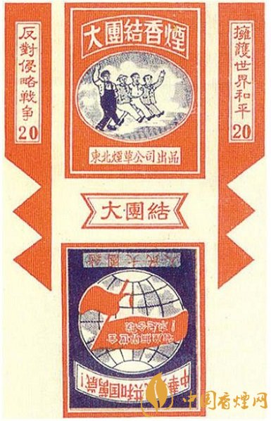 東北煙草公司出品的“大團(tuán)結(jié)”煙標(biāo),主版圖案為4個(gè)男性人物攜手并進(jìn)的場(chǎng)景,側(cè)標(biāo)位置分別印有“擁護(hù)世界和平”“反對(duì)侵略戰(zhàn)爭(zhēng)”字樣,副版圖案為地球上飄揚(yáng)著一面上書“全世界無產(chǎn)者聯(lián)合起來”字樣的旗幟,在其上下則分別印有“中華人民共和國萬歲”“人民大團(tuán)結(jié)”字樣。